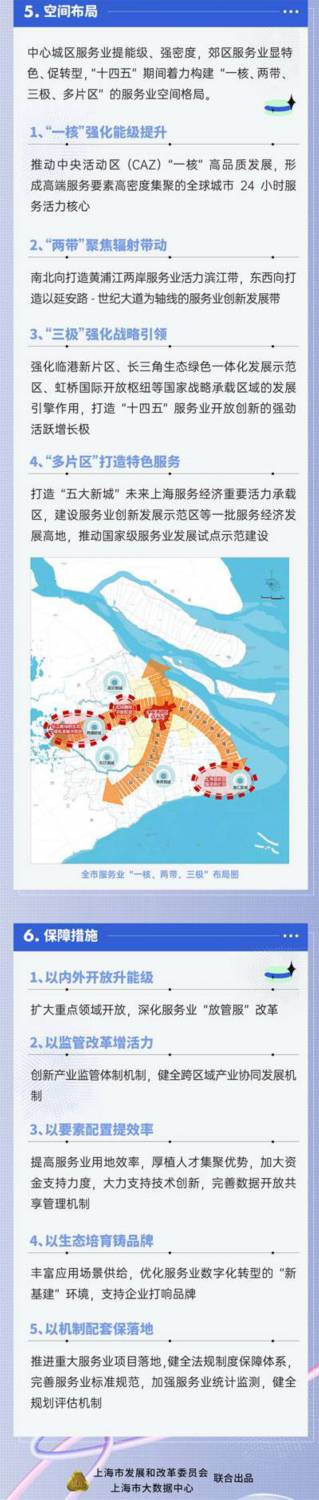 空間格局方面,“十四五”上海將著力構建“一核、兩帶、三極、多片區”為主體的服務業。中央活動區突出總部經濟、樓宇經濟和街區經濟,形成高端服務要素高密度聚集的全球城市24小時服務活力核心。南北向打造黃浦江兩岸服務業活力濱江帶,東西向打造以延安路-世紀大道為軸線的服務業創新發展帶。自貿試驗區臨港新片區、長三角生態綠色一體化發展示范區、虹橋國際開放樞紐等打造服務業開放創新的強勁活躍增長極。