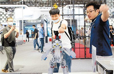 參觀者(中)在2021世界人工智能大會展會現場體驗體感機器人玩具。