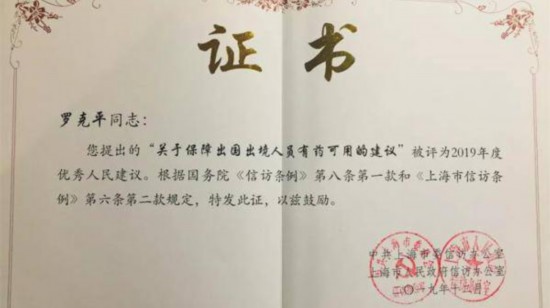 2013年12月,因生活中遇到的證件辦理問題,他向“市長信箱”寫了第一封建議信。在年底表彰時,還被上海市信訪辦評為“上海市優秀人民建議”!霸谑盏綍h通知頒獎前,我竟然不知道上海有這么一項榮譽稱號!绷_克平捂起嘴巴靦腆地笑了。他發現,2011年上海市信訪辦成立人民建議征集處后,每年年底都會評選百件優秀建議以鼓勵百姓向政府建言獻策。