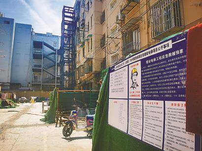 一進小區大門,東側101號樓前,電梯的混凝土框架赫然映入眼簾。工人們正頂著炎炎烈日,在已成型的電梯框架里抓緊施工。小區其他樓幢前,也都圍起綠色防護網,施工銘牌上標著“多層住宅電梯項目”的字樣。