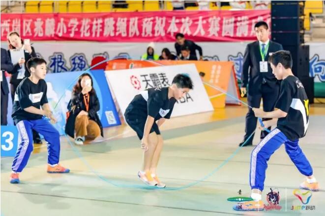 這一30秒混合交互繩單搖跳比賽中,有來自上海、重慶、廣東、河南、山東等地的21支隊伍參賽。一跳二搖——姜大禮、許東平負責搖繩,黃俊凱負責跳,速度賽拼的是暴風速度、耐力和零失誤,賽場上競爭激烈,畫面左上角的“黃姜許”三人組合,又快又穩,看得人眼花繚亂。