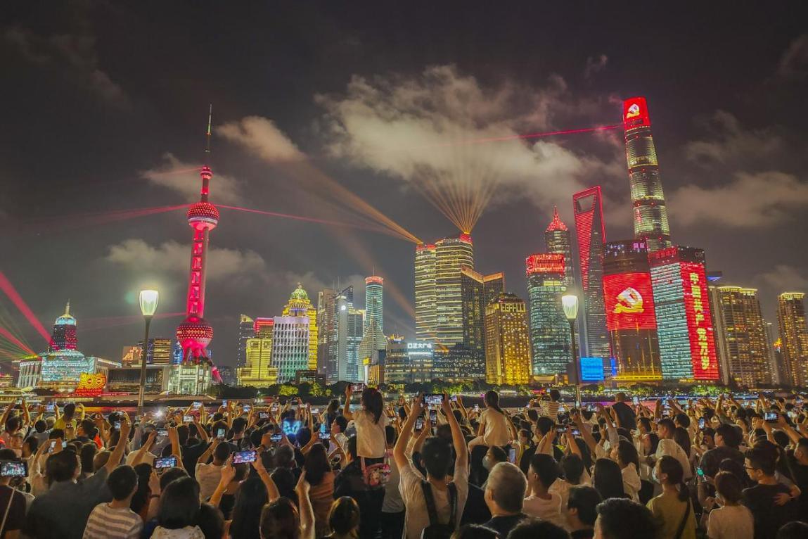 “永遠跟黨走”黃浦江主題光影秀吸引如潮人流
