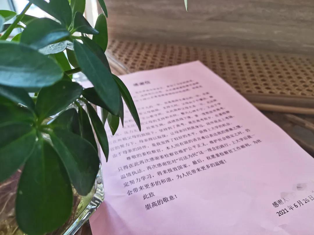 徐某女兒在感謝信中說道:“在我高考沖刺之際,和父母無法聯系溝通,整天心神不寧,又由于學習緊張,壓力太大,曾一度想放棄高考。就在高考前,在檢察官的努力下,母親得以取保。由于母親的陪伴,使我發揮了較好的水平,獲得上大學的機會!