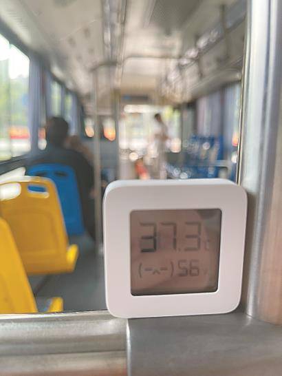 記者首先選擇了距離入口較近的1803路公交線路。溫度計顯示,室外溫度達到35℃。進入車內時,車上大半座位都坐上了乘客,司機也已在駕駛位等候啟動,但車上并未開空調。司機頭頂的LED屏幕顯示,車內溫度高達33℃,僅比車外低2℃。再看乘客們多半緊皺眉頭,有的不時歪頭用肩袖擦一下額頭密布的汗珠,一些經驗豐富的乘客則拿出便攜小電扇、紙扇降溫。近10分鐘后,司機啟動車輛出發,空調這才打開,車里溫度才開始逐漸下降。一直等到線路過半時,車內溫度才終于降低至26℃。但由于該線路是環線,絕大多數始發站上車的乘客已下車,享受不到涼爽的車內環境了。