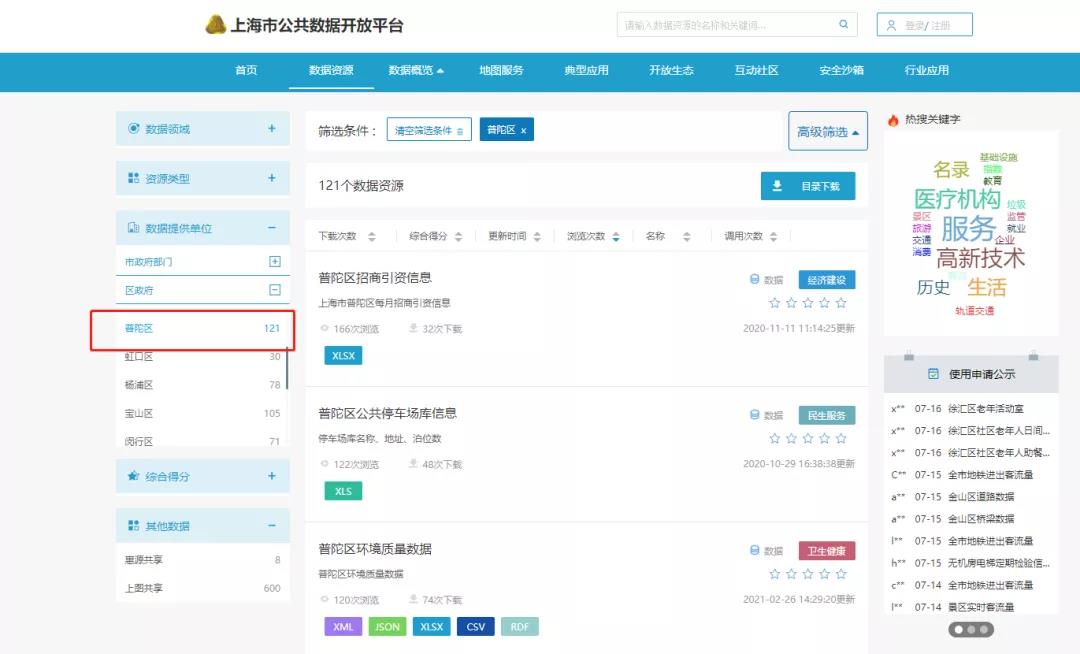 上海市公共開放數據平臺上普陀區子欄目入口界面