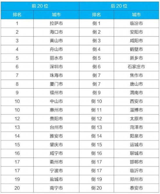 生態環境部對168個重點城市空氣質量進行了排名,臨汾、安陽和咸陽市等城市空氣質量相對較差(從倒數第1名至倒數第20名);拉薩、?诤忘S山市等城市空氣質量相對較好(從第1名至第20名)。