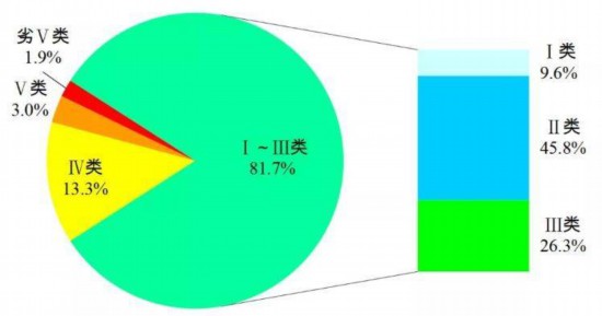 。1-6月全國地表水水質類別比例,圖片來源:生態環境部)