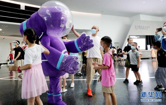 7月18日,上海天文館吉祥物“科飛”在入口大廳內與參觀者互動。