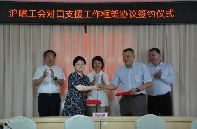 調研期間,上海市總工會與市對口援疆工作前方指揮部、喀什地區工會共同召開了滬喀工會對口協作工作交流會暨2021年上海援疆勞動競賽啟動儀式,簽署了《上!陆κ补䦟谥гぷ骺蚣軈f議(2021年-2023年)》;啟動了“點亮微心愿”活動,向守衛祖國邊陲的護邊員贈送了1000套防護服;啟動了2021年上海援疆勞動競賽,為上海援疆職工書屋揭牌。