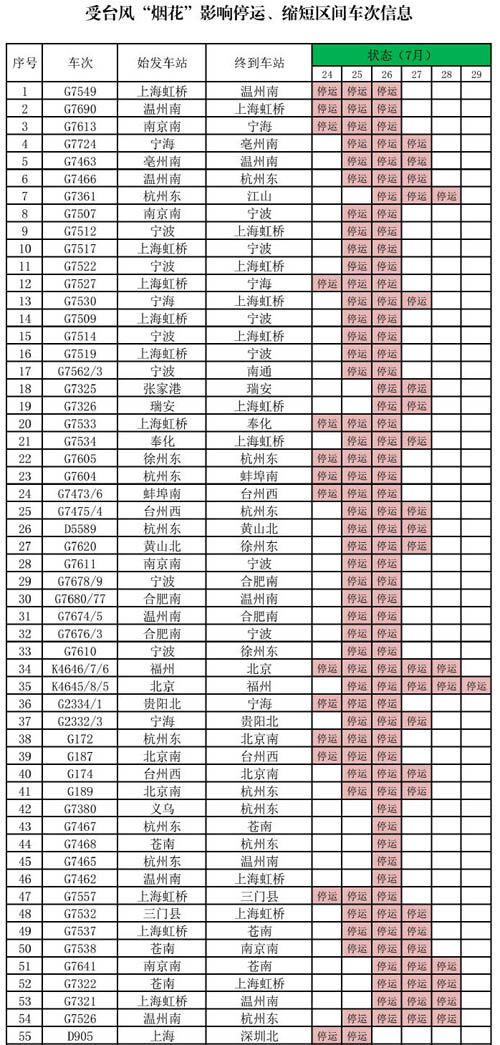 人民網上海7月24日電 (唐小麗)針對今年第6號臺風“煙花”可能帶來的影響,為確保旅客列車運行安全,上海鐵路部門決定自7月24日至29日,對杭深鐵路寧波至溫州段、滬昆高鐵及鐵路義烏至諸暨段、杭甬鐵路、金溫鐵路間列車采取臨時停運措施,部分列車停運。