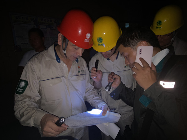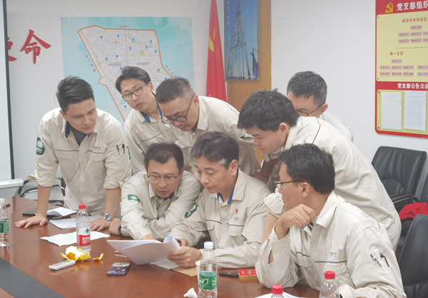 國網上海電力搶修人員深夜在現場討論搶修方案