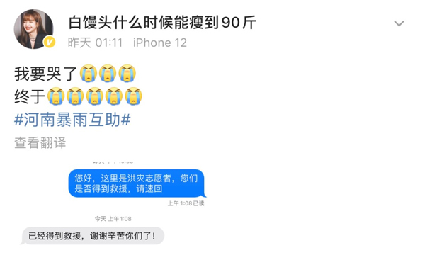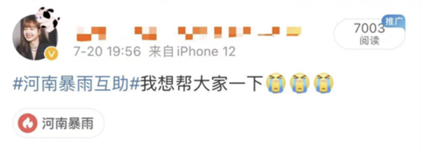 19:56分,她在微博中發了第一條#河南暴雨互助#話題:“我想幫大家一下”。