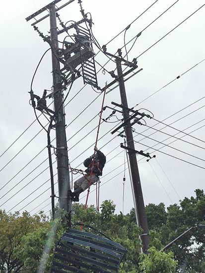 受“煙花”臺風影響,金山區紅旗東路山陽社區醫院附近的大樓多個空調外機護欄脫落在電力設備上引發停電。國網上海金山供電線路操作班15分鐘內趕到現場,20分鐘成功恢復供電。圖為搶修人員正在清理線路異物。
