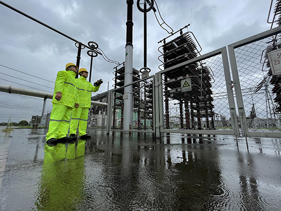500千伏華新換流站是外電入滬的重要樞紐之一,擔負著確保三峽水電順利落地上海的任務。圖為國網上海檢修公司運維人員冒雨對戶外重要設備開展特巡。