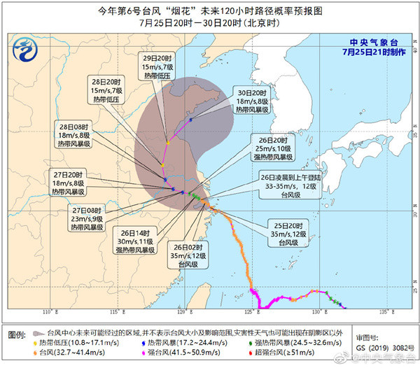 中央氣象臺7月25日晚間發布的臺風路徑預報圖。
