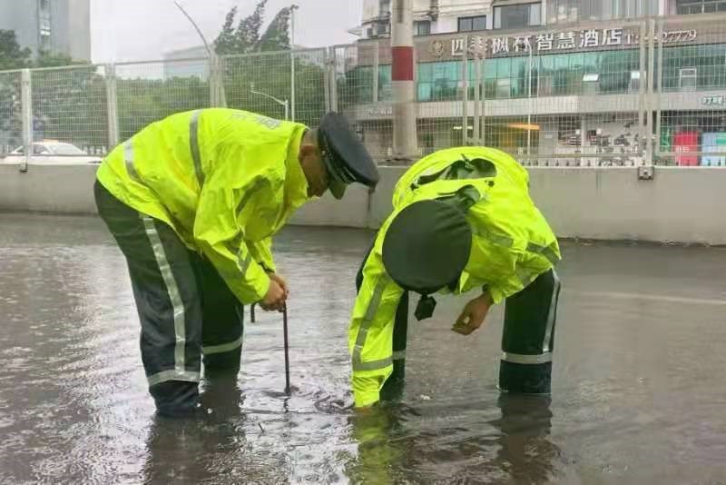邯鄲路近運光路路面積水,楊浦公安分局交警支隊北塊機動大隊民警王晴迅速采取應急措施,手動清除下水口雜物。