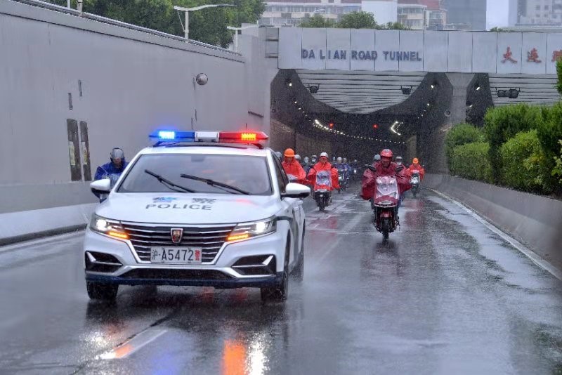 虹口交警有序護送非機動車隊從大連路隧道安全過江。