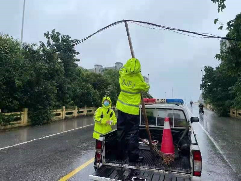 松江交警支隊民警錢亮、李豐,特保陸瑋斌在九亭大街盛龍路,發現一處高空電線掉落,影響通行安全,隨即用木棍將電線托舉半空,等待電力部門前來搶修。