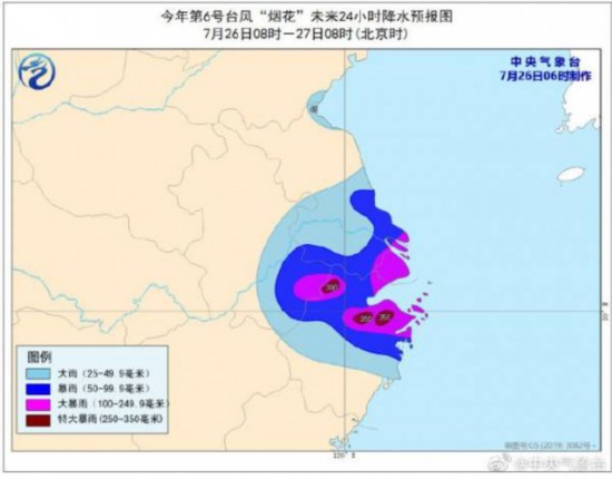 降水預報:26日08時至27日08時,浙江中北部、上海、江蘇中南部和東部、安徽東南部等地有大雨或暴雨,其中,浙江北部、上海、江蘇東南部、安徽東南部等地的部分地區有大暴雨,浙江北部等地的局地有特大暴雨(250-350毫米)。