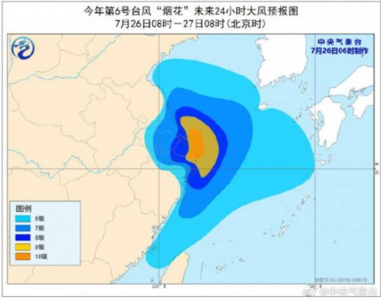 大風預報:26日08時至27日08時,臺灣海峽北部、黃海中部和南部、東海大部、長江口區、杭州灣、江蘇東部、上海、浙江東部、福建北部沿海將有6-7級大風,陣風8-9級,其中東海西北部、黃海西南部、浙江東北部沿海、長江口區、杭州灣、上海沿海、江蘇沿海的風力有8-9級,陣風10-11級,局地海域或地區風力可達10-12級,陣風12-14級。