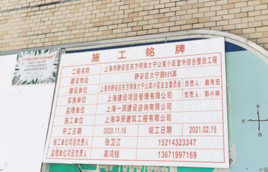 一進南門,小區門口首先映入眼簾的是三種顏色深淺不一的水泥地,像打了“補丁”一樣,地面上還留有一些細小的碎石子。大門東側,告示欄還懸掛著施工銘牌,工程名稱為“上海市靜安區東方明珠大寧公寓小區室外綜合整治工程”,自2020年11月16日開始施工,預計竣工日期為2021年2月15日。