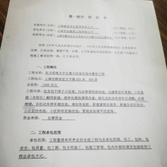 整治工程為何“爛尾”?小區業主丁女士講述了原委。原來,小區隔壁久光百貨在建設時開挖地基,造成小區道路沉降和管道損壞,后賠償小區1000萬元用于修繕。此后,由業委會作為甲方,再由街道推薦上海建設項目管理有限公司作為“代甲方”,與施工方上海華辰建筑工程有限公司簽署了合同,開展綜合改造。