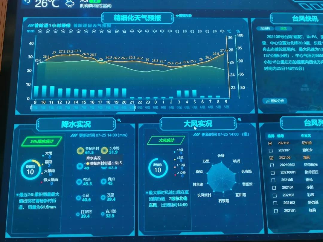 臺風期間,普陀區城運中心成為全區突發情況的信息匯集地,工作人員將這些信息快速發送給相關職能部門,聯動多部門進行精準高效的處置,確保了臺風天氣下的城市安全運行。其中新近上線的智慧氣象和智慧防汛模塊,為迎擊“煙花”中提供了重要的數據信息和有力的決策支撐。