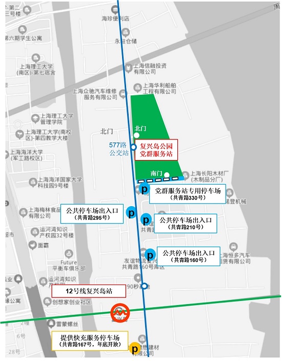 為了更好地服務黨建團隊客流,共青路330號、復興島公園南門邊一條綠意盎然的綠色長廊被改建為黨建團體車輛專用?奎c。