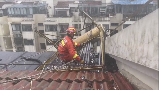 虹口區場中路755弄49號居民家中屋頂的鐵皮被風掀翻,隨時有掉落危險,江楊站對鐵皮進行破拆拆除,排除險情。