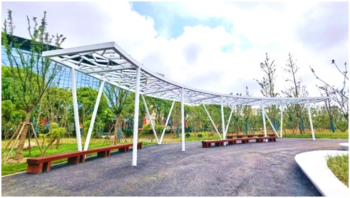 公園的景觀小品“紫藤廊”和“云廊”的造型設計以連動為設計理念,強化空間與景觀的結合關系。通過條狀的白色格柵的運用,游園者可以在陽光之下感受光與影的造景魅力。