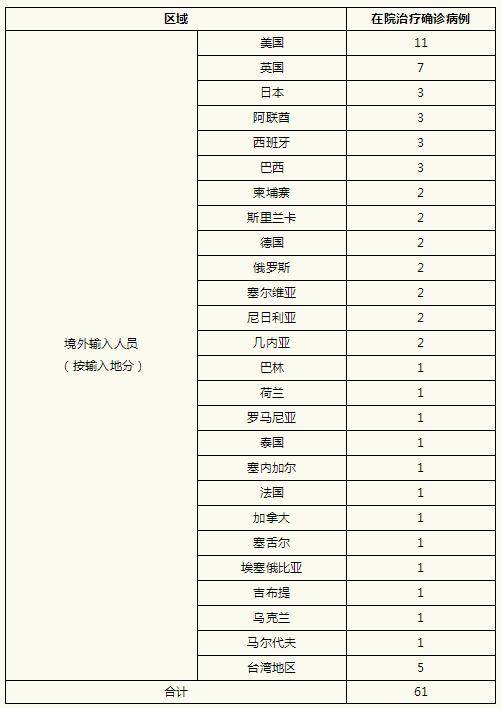 截至2021年7月29日24時,累計境外輸入性確診病例1928例,出院1867例,在院治療61例(其中重癥1例),F有待排查的疑似病例2例。