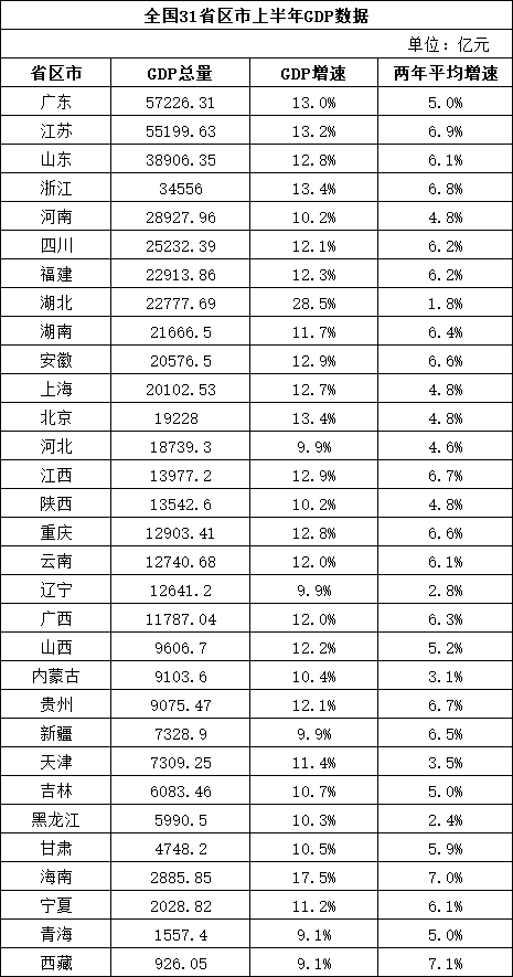 近期,各地陸續發布上半年經濟數據,截至目前,31個省區市GDP數據均已出爐。數據顯示,跟全國上半年12.7%的經濟增速相比,10個省區市GDP增速跑贏全國,湖北增速最高,達到28.5%;廣東、江蘇、山東GDP規模繼續保持前三甲的格局。