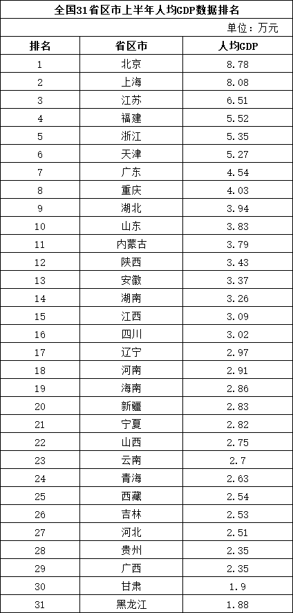 全國31省區市上半年人均GDP數據排名。制表:王震
