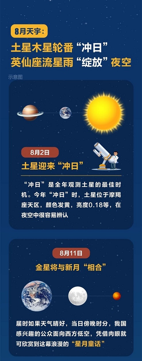此外,8月還有三個天象值得關注,分別是8月2日的土星沖日、8月19日的水星合火星、8月20日的木星沖日。土星和木星都是氣態巨行星,通過天文望遠鏡,可以看到土星的光環、木星的大紅斑。所謂“沖日”,是指地球軌道以外的行星與太陽的黃經相差180度,相當于行星運行到“滿月”的相位上,這時候是觀測外行星的最佳時機。如果你有天文望遠鏡,不妨在土星、木星沖日那天夜晚進行觀測,一睹氣態巨行星的風采。