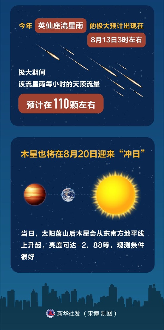 8月天氣炎熱,又逢學生暑假,歷來是夜間觀測天象的最佳時期。其中最值得觀測的天象當屬英仙座流星雨,今年這場流星雨的活躍期為7月17日—8月24日,極大期為8月12日至14日,理想狀態下每小時流星數可能達到100—110。上海天文館網絡科普部部長施韡建議,天文愛好者和親子家庭可在8月12日23時至8月13日4時觀測這場“夜空禮花”。