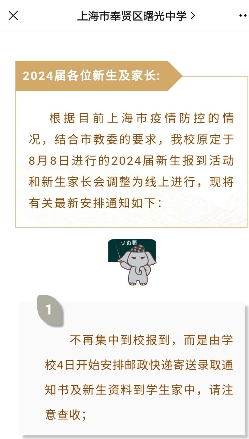 奉賢區曙光中學官微發布“關于調整2024屆新生報到方式的通知”,該校原定于8月8日進行的2024屆新生報到活動和新生家長會調整為線上進行。學校通知不再集中到校報到,而是由學校4日開始安排郵政快遞寄送錄取通知書及新生資料到學生家中;開學前的各項準備工作仍然按照原定計劃和時間,將及時通過校園網站、官微、新生報到釘釘群發布。學校還特別提醒,請各位新高一準新生務必留滬,最近無特殊情況不出上海。