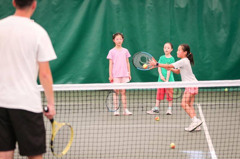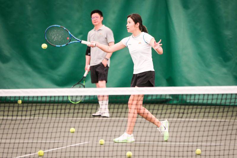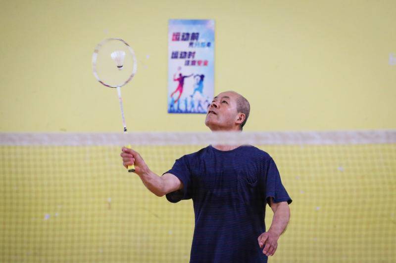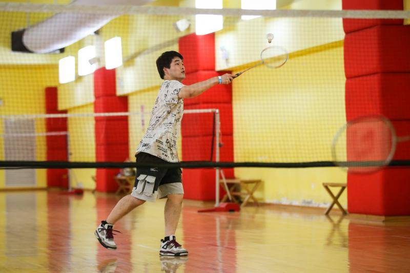 人們在靜安區運動健身中心一樓的場館內打羽毛球。