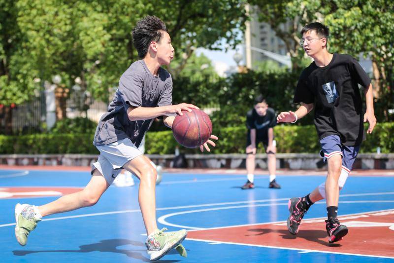 籃球愛好者來到源深體育中心室外籃球場打球。