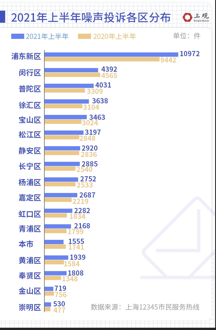 今年上半年的51938件噪聲投訴中,來自浦東新區的投訴占到10972件,位列首位。閔行區、普陀區、徐匯區、寶山區、松江區這5個區,分別以4392件、4031件、3638件、3463件和3197件投訴緊隨其后,成為申城噪聲投訴較為突出的區域。