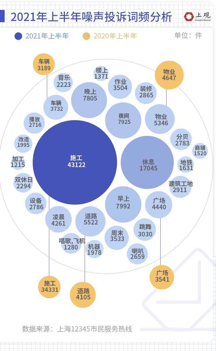 日前,解放日報·上觀新聞記者又從12345市民服務熱線獲取了2021年上半年的噪聲投訴數據。數據顯示,2021年上半年“12345”共接到噪聲投訴51938件,相比2020年同期的45959件仍增幅明顯。