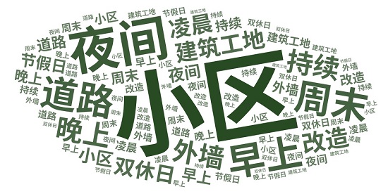 此外,在投訴中出現2655次的高頻詞“建筑工程”,也提醒建管部門傳統的開發類建筑工地仍然是噪聲投訴的熱點!懊刻烨宄6時就開始打樁”“露天切割加工鋼材”“車輛進出轟鳴聲不斷”等都是常見的投訴。