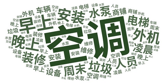 梳理投訴內容發現,針對物業的噪聲投訴主要為兩類:一類為各類設施設備發出的噪聲,如空調、水泵、電梯等,其中尤以空調室外機安裝不當引發的投訴最多。此外還有電瓶車警報器夜半亂響、快遞柜關門乒乒乓乓、車輛進出道閘語音播報喋喋不休等,都引發了不少的市民投訴;另一類則為居民活動和物業管理作業引發的噪聲。3789件投訴中,251件為投訴鄰居裝修不遵守時間承諾,擾民現象突出。110件為投訴物業垃圾清運開展得太早,清晨6時左右就攪人清夢。此外,還有車輛進出小區的鳴笛聲、業主將房屋出租給多人后的深夜活動聲等等,也是小區常見的噪聲投訴對象。
