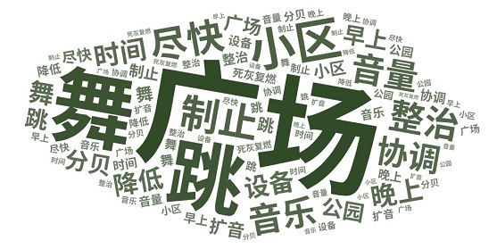 51938件噪聲投訴中,另一類值得注意的,是2538件廣場舞引發的噪聲投訴。以“廣場”作為關鍵詞進行詞頻分析顯示,去年上半年受疫情影響,廣場舞引發的噪聲投訴少了很多。但今年上半年,此類投訴再次成為僅次于“施工”和“小區”的第三大類投訴。投訴內容顯示:在申城的人行道、小區花園、社區公園、文化廣場、商業廣場等各類空地上,每天早晚均有人架起擴音器“翩翩起舞”,有時多達百人聚集,附近居民的感受往往是“聲音非常吵鬧”,從而產生投訴。并且,廣場舞引發的噪聲投訴往往會成為“頑疾”,一些市民不僅反復撥打“12345”投訴,還“多次撥打了110報警”,由此推高了這類投訴的數量。
