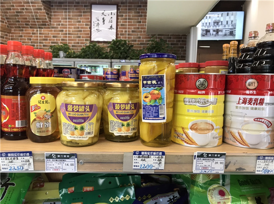 記者在貨架上還找到一些懷舊產品:老上海人熟悉的“福牌”樂口福和麥乳精,還是鋁合金桶裝,還是紅配黃、紅配白的包裝顏色,據說銷售得很好;外面超市現在已很少看到的菠蘿罐頭、黃桃罐頭,黃澄澄地浸在糖水里面,很是誘人。
