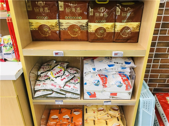 這里的“拳頭產品”,當然還是各種米面糧油。收銀臺一側的貨架上,是一排排各種各樣的面粉,制作各種面食使用。如,一款“古寺”牌的“上海水磨糯米粉”,店長程冬玲告訴記者,這款糯米粉是做手工湯圓用的,采用江蘇圓粒特級糯米經過浸泡加工而成,做出來的湯圓潤滑、細膩。