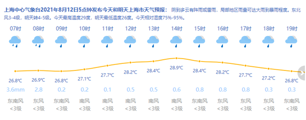 上海中心氣象臺2021年8月12日5點鐘發布今天和明天上海市天氣預報:陰到多云有陣雨或雷雨,局部地區雨量可達大雨到暴雨程度。東北風3-4級,明天轉4-5級。今天最高溫度29度,明天最低溫度26度。