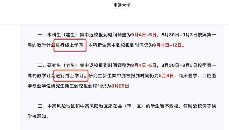 此外,南通大學也對學生返校時間進行調整,并明確按照第一周的教學計劃進行線上授課↓