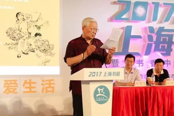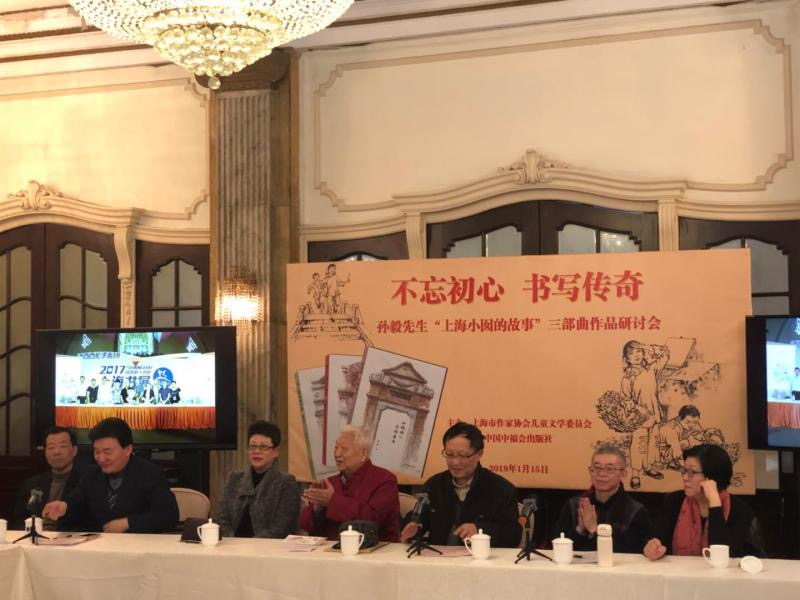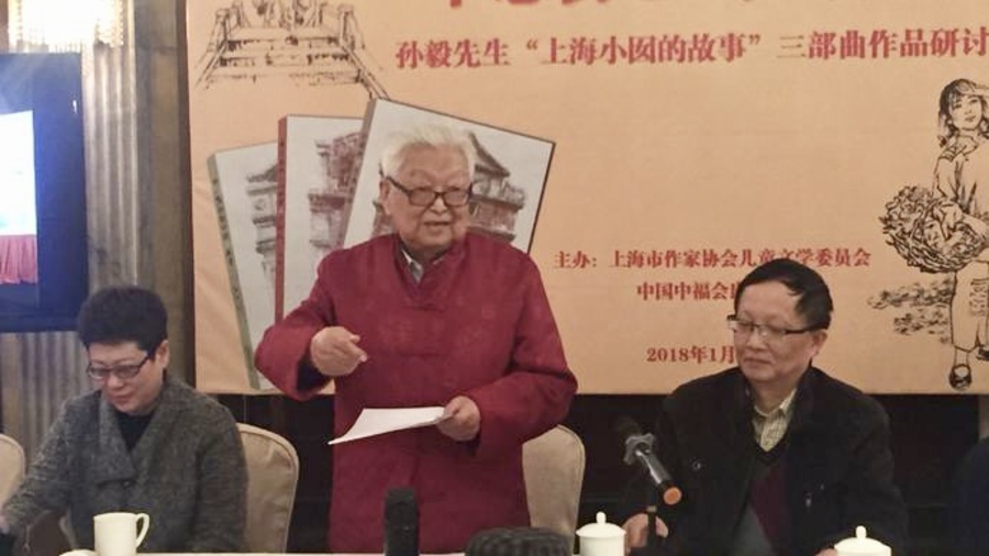孫毅95歲了。2018年1月15日下午,身穿紅色中裝、精神矍鑠的他出現在上海作協大廳,假如不做介紹,恐怕沒人能猜得到他的實際年齡。更讓人驚訝的是,這位“太爺爺級”作家竟以95歲高齡交出了長篇小說三部曲《上海小囡的故事》。作品研討會上,同為“90后”的兒童文學老學者蔣風寫來賀信,戲言這是“跨進新時代的老公雞一連下了三個蛋”,滿座皆歡,孫毅也笑了。