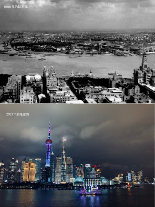 陸家嘴今夕對比。上圖:浦東區委宣傳部供圖;下圖:人民網 馬作鵬攝