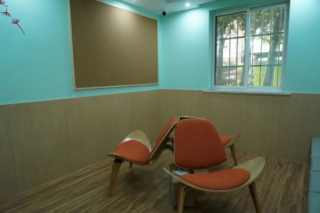 走進基地里,可以看到這里分成了診斷、診療、展望三個區域,包含心理疏導室、親職室、宣泄室、課堂診療室等多個功能性教室;剡\用虛擬現實(VR)、人工智能(AI)、多媒體投影等先進技術,對那些誤入歧途的涉罪未成年人和他們的失職監護人進行教育矯正,是上海首家集專業化、智慧化、多元化于一體的親職教育基地。